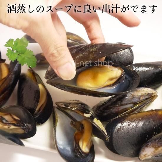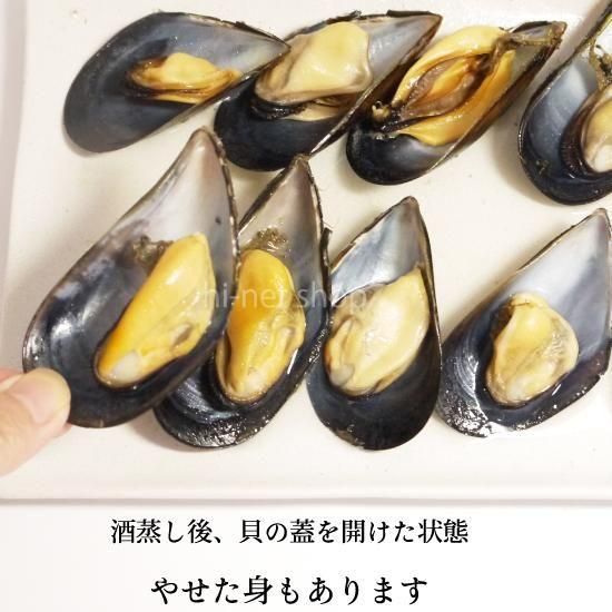 ※発送時には良いものを選別していますが、天然ものですので、サイズ混合で、調理後、開けてみると中の身がやせたものもあります。また、輸送中にムール貝から海水がでてきたりして、発送時より重量が目減りするようですので、発送時には500gくらい多めに入れております。