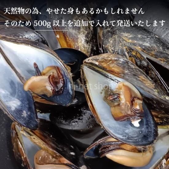 【お届け状態につきまして】天然ものですので、サイズ混合で、あけてみると中身の身がやせたものもあります(発送時にはいいものを選別していますが、中身が空けられないので、身の状態がわからないため)。また、輸送中にムール貝から海水がでてきたりして、発送時より重量が目減りするようですので、発送時には500gくらい多めに入れております。