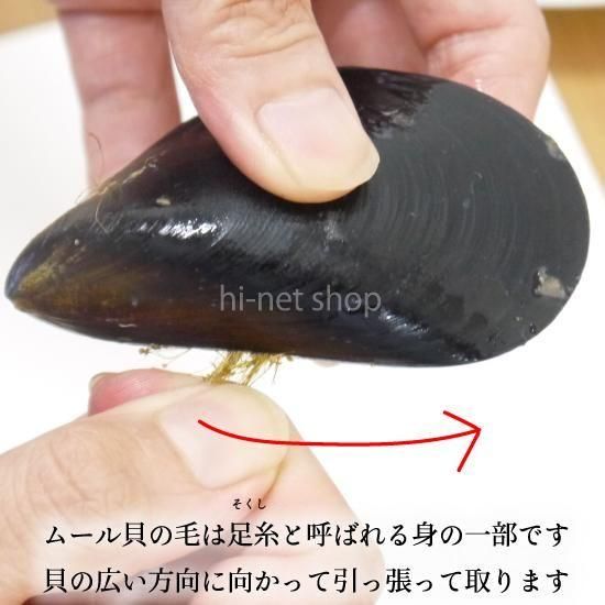 ムール貝から出ている、ひげのような毛のようなものはムール貝の身の一部で、足糸(そくし)と呼ばれるものです。貝の大きいほうへ向かって引っ張りながら、取り除いてください。(無理にとろうとすると身を傷つけ弱らせるので、とれる範囲で取ってください。取り切れなかった足糸は調理後、取り除いてください。)。