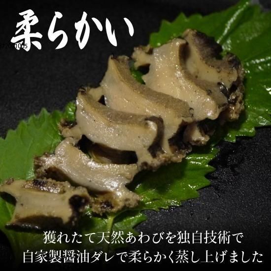 北三陸の天然アワビのむきたてを自家製醤油ダレで仕上げました。独自製法で柔らか〜く蒸された、肝(としろ)付きで丸ごとアワビ1個入っています。まさにご馳走です。